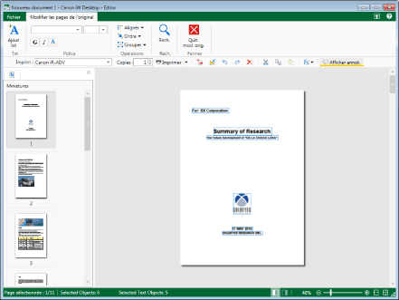 Si l'utilisateur sélectionne un objet dans la Fenêtre de travail, le nombre total d'objets sélectionnés et le nombre d'objets texte s'affichent sur la barre d'état.