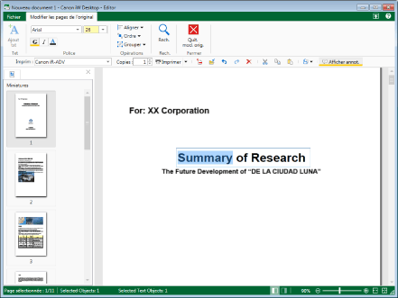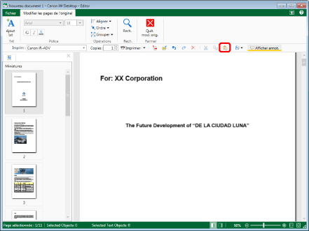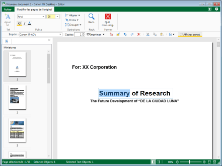 Si l'utilisateur sélectionne un objet dans la Fenêtre de travail, le nombre total d'objets sélectionnés et le nombre d'objets texte s'affichent sur la barre d'état.