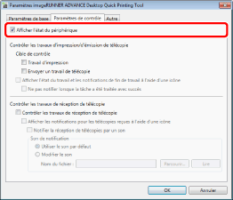 Seul l'état des périphériques dont les informations ont été récupérées peut être contrôlé par Quick Printing Tool. Les informations sur le périphérique sont récupérées automatiquement lors du démarrage de Desktop Monitor Setup.
