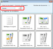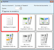 La boîte de dialogue [Impression] ou la boîte de dialogue [Imprimer] de l'application utilisée pour créer le document peut s'afficher. Dans ce cas, sélectionner [Desktop Document Writer] comme imprimante et lancer l'impression.