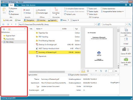 Registerkarte [Bibliotheken]: Zeigt eine Strukturansicht der Bibliotheken, Auscheck-Ordner und der Ordner Eigenes Fach an.