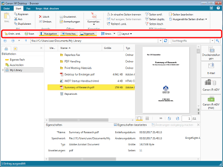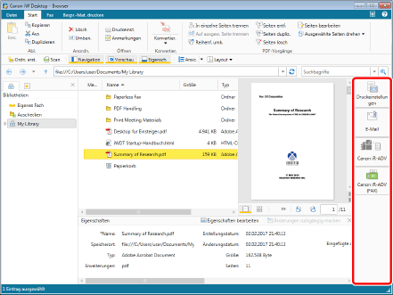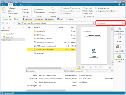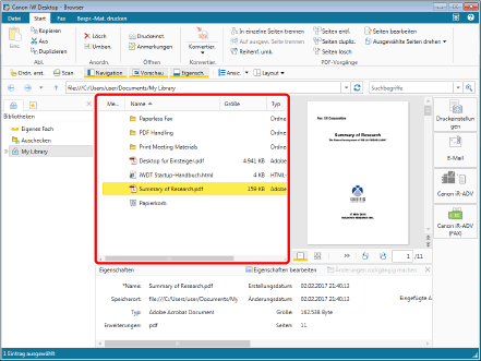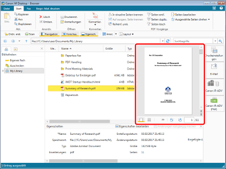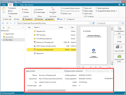 Im Eigenschaftenfenster werden Informationen (Eigenschaften) des im Navigations- oder Dateilistenfenster ausgewählten Dokuments oder Ordners angezeigt.