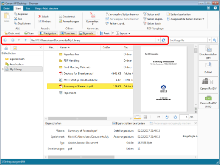 Die Adressleiste zeigt den Pfad einer ausgewählten Bibliothek, des Ordners Eigenes Fach oder eines anderen Ordners. Sie können in der Adressleiste auch auf