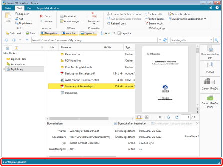 Die Statusleiste zeigt auch die Anzahl der Suchergebnisse sowie den Namen des angemeldeten Benutzers der SharePoint Serverbibliothek an. Wenn die Lizenz von der Site-Lizenz authentifiziert wird, werden außerdem die Kundeninformationen (z. B. der Firmenname) angezeigt.