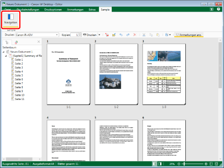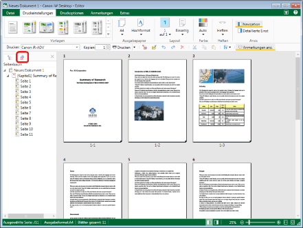 (Miniaturansichten): Zeigt Miniaturansichten der Dokumentseiten an. Sie können auf die Miniaturansichten klicken, um die zugehörige Seite für die Anzeige oder Bearbeitung auszuwählen.