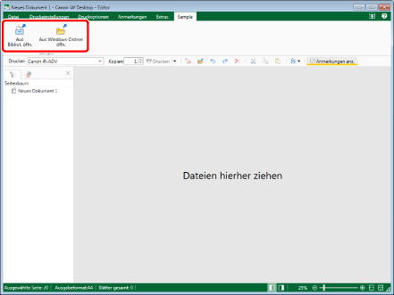 Menü [Datei] > [Optionen] > [Systemeinstellungen] > [Editor] > [Optionen] > [Originaldokument unter Canon Desktop Document speichern]