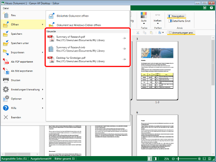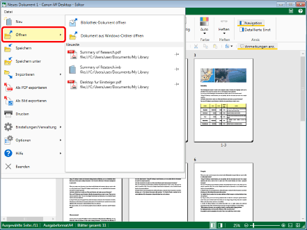 Mit Desktop Editor können maximal 10 Dokumente durch Klicken auf [Öffnen] oder [Anmerkungen] geöffnet werden.