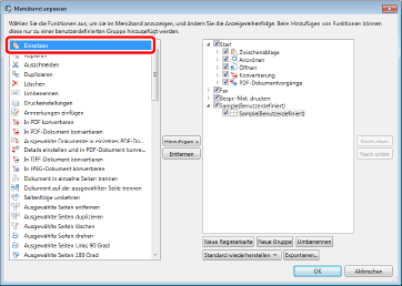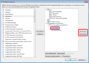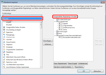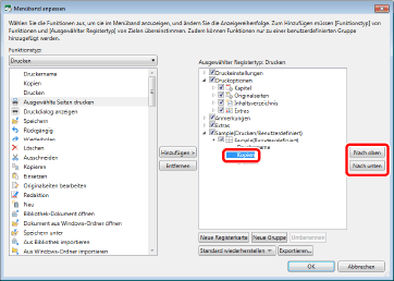 Die Reihenfolge, in der die Gruppenbefehle der standardmäßig angezeigten Registerkarten angezeigt werden, kann nicht geändert werden.
