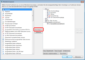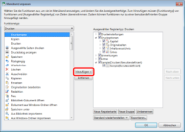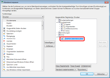 Sie können einer im Menüband hinzugefügten Gruppe keine Befehle hinzufügen, indem Sie sie in der Liste auf der linken Seite des Dialogfelds [Menüband anpassen] auswählen.