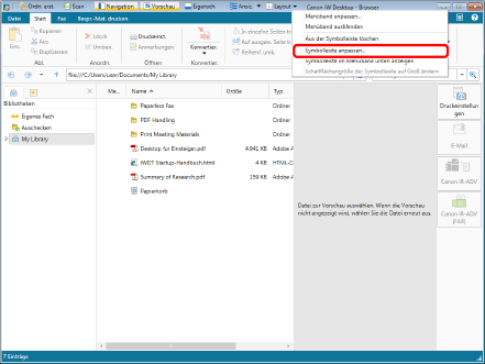 Klicken Sie mit der rechten Maustaste auf das Menüband oder die Symbolleiste, und wählen Sie [Symbolleiste anpassen].