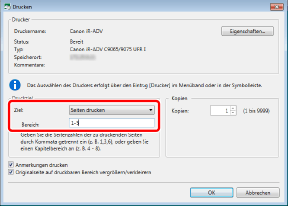 Die Eingabereihenfolge unter Bereich entspricht nicht der Druckreihenfolge. Unabhängig davon, ob Sie "1,2" oder "2,1" eingeben, werden die Seiten in der Reihenfolge "1,2" gedruckt.