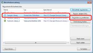 Wählen Sie eine Bibliothek aus, deren Registrierung aus [Registrierte Bibliotheksliste] entfernt werden soll, und klicken Sie dann auf [Registrierung entfernen].