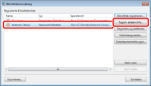 Wählen Sie die Netzwerkbibliothek in [Registrierte Bibliotheksliste] aus und klicken Sie dann auf [Registr. ändern Info].