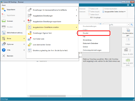 Menü [Datei] > [Extras] > [Ausgabeleiste-Einstellungen] > (Name des Druckers, dessen Einstellungen geändert werden sollen) > [Ändern]