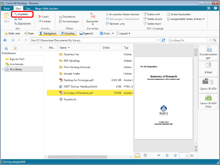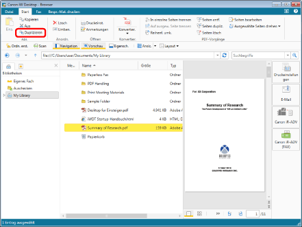 Wenn Sie ein Dokument auswählen, können Sie es mit dem Dokument-Zielordner duplizieren.