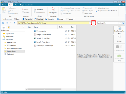 Wenn Sie einen Dokumentpfad in die Adressleiste eingeben, wird der Ordner, in dem das Dokument gespeichert ist, im Navigationsfenster angezeigt. Das Dokument wird im Dateilistenfenster ausgewählt, die mit dem Dokument verknüpfte Anwendung wird aufgerufen und das Dokument wird angezeigt.