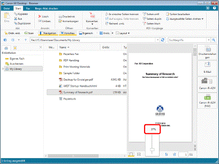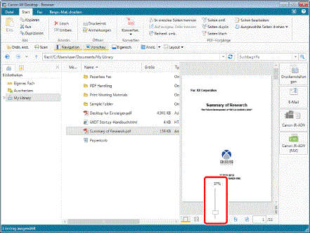 Um den Vergrößerungsfaktor festzulegen, geben Sie ihn direkt im Feld [Zoom] ein. Sie können den Vergrößerungsfaktor in 1%-Schritten eingeben. Wenn Sie einen Wert außerhalb des zulässigen Wertebereichs eingeben, werden die Seiten automatisch mit dem Vergrößerungsfaktor angezeigt, der diesem Wert am nächsten kommt. Wenn Sie keine Ganzzahl angeben, wird der bisherige Vergrößerungsfaktor beibehalten.