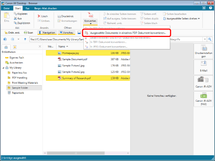 (Konvertier.) und wählen Sie [Ausgewählte Dokumente in einzelnes PDF-Dokument konvertieren].