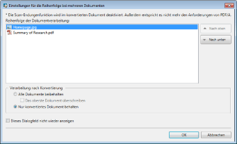 Auch wenn Sie die Einstellung gewählt haben, dass das Dialogfeld nicht angezeigt wird, können Sie es anzeigen, indem Sie das Kontrollkästchen [Wählen Sie die Reihenfolge der Dokumentverarbeitung bei der Konvertierung ausgewählter Dokumente in einzelne PDF-Dokumente aus] aktivieren.