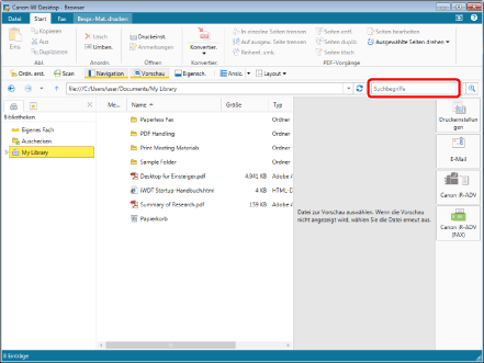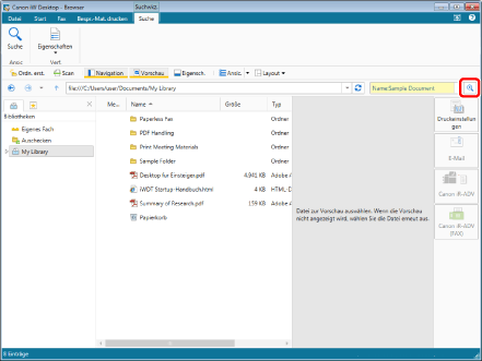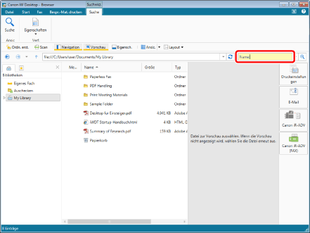 Der Pfad der zu durchsuchenden Bibliothek bzw. des zu durchsuchenden Ordners wird im Suchbildschirm unter [Speicherort durchsuchen] angezeigt.