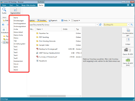 Bei der Suche nach Dokumenten mithilfe der einfachen Suchleiste mit Eigenschaftsdaten können Sie eine Detailsuche durchführen, indem Sie das Format 'Eigenschaftsname:Suchschlüsselwort' verwenden. Sie können schneller suchen, indem Sie die Eigenschaften der Suchziele festlegen. (Sie können einen Zweibyte- oder einen Einbyte-Doppelpunkt verwenden.)
