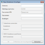 Wenn [G3/G4] für [Übertragungsmodus] ausgewählt und das Kontrollkästchen [ISDN Subadresse spezifizieren] aktiviert ist: max. 44 Bytes für die Faxnummer (37 Bytes, ausgenommen "-", "(" und ")").
