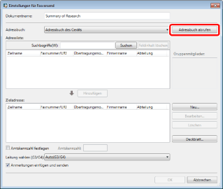 Zum Abrufen von Adressen für die IP-Faxfunktion aus dem Adressbuch eines imageRUNNER ADVANCE-Geräts muss Version 3.1.0 oder höher von Desktop Communicator auf dem imageRUNNER ADVANCE-Gerät installiert sein. Mit Version 3.0.0 oder früher werden nur die Empfängernamen abgerufen.
