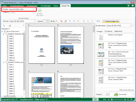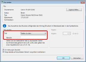Wenn das Kontrollkästchen [Druck/Faxversanddialog anzeigen] aktiviert ist, wird das Dialogfeld [Fax senden] angezeigt. Nähere Informationen zur Verwendung des Dialogfelds [Fax senden] zum Senden von Dokumenten per Fax finden Sie hier: