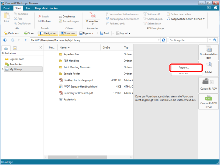Sie können denselben Vorgang auch ausführen, indem Sie auf die im Menüband oder in der Symbolleiste angezeigte Mailausgabetaste klicken und [Ändern] wählen. Wenn ein Ausgabesymbol nicht im Menüband oder in der Symbolleiste angezeigt wird, lesen Sie in folgenden Abschnitten nach, wie Sie es anzeigen.