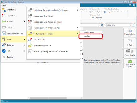 Wenn Sie einen bereits registrierten Ordner „Eigenes Fach“ neu konfigurieren oder löschen möchten, kann er nicht neu konfiguriert oder gelöscht werden, wenn sich Dokumente im Ordner „Eigenes Fach“ befinden. Löschen Sie zuerst die Dokumente aus dem Ordner „Eigenes Fach“, bevor Sie ihn konfigurieren oder löschen.
