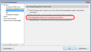 [Systemeinstellungen] > [Browser] > [Verwaltung freigegebener Dokumente] > [Bei Doppelklick Dokumente schreibgeschützt öffnen]
