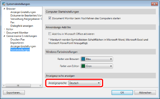 [Systemeinstellungen] > [Gemeinsame Einstellungen] > [Voreinstellungen] > [Anzeigesprache anzeigen]