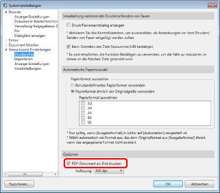 Wenn das Kontrollkästchen [PDF-Dokument als Bild drucken] aktiviert ist, werden alle PDF-Dokumente als Bilder gedruckt bzw. gefaxt. Wenn Sie das Kontrollkästchen deaktivieren, werden sie wieder als PDF-Dokumente gedruckt bzw. gefaxt.