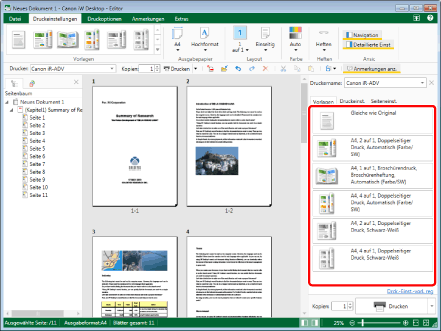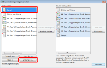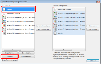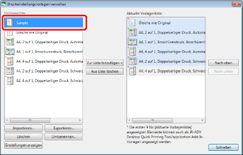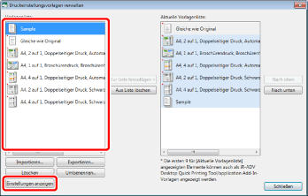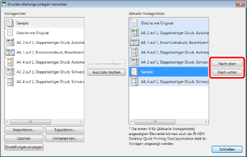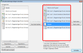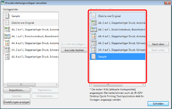Die neun Vorlagen, die ganz oben unter [Aktuelle Vorlagenliste] im Dialogfeld [Druckeinstellungsvorlagen verwalten] angezeigt werden, sind die im Quick Printing Tool festgelegten Druckvorlagen.