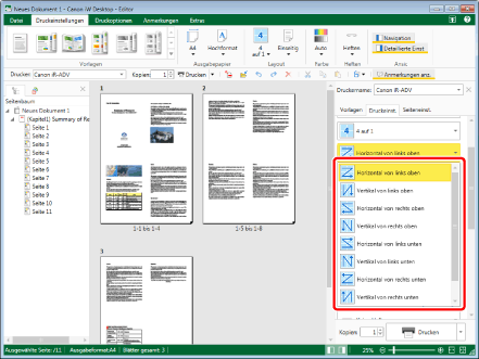 Wenn Sie für das Seitenlayout nicht [2 auf 1], sondern eine andere Einstellung ausgewählt haben, stehen Ihnen in der Pulldown-Liste folgende Reihenfolgen zur Auswahl: