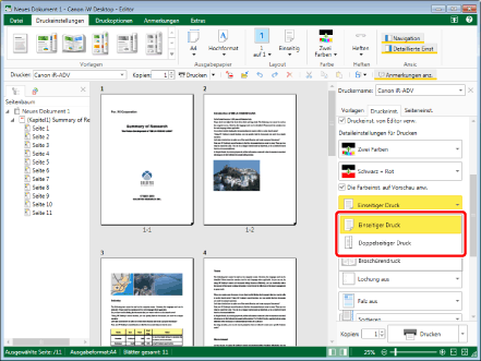 Diese Funktion ist nur möglich, wenn Sie einen Canon-Drucker auswählen und das Kontrollkästchen [Druckeinst. von Editor verw.] auf der Registerkarte [Druckeinst.] in der Detailansicht, im Menüband oder über die entsprechende Schaltfläche der Symbolleiste aktivieren.