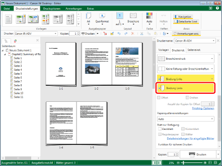 Die für die Broschürenheftung verfügbaren Einstellungen ändern sich in Abhängigkeit von den Optionskonfigurationen für Drucker, die unter [Drucker] ausgewählt sind.
