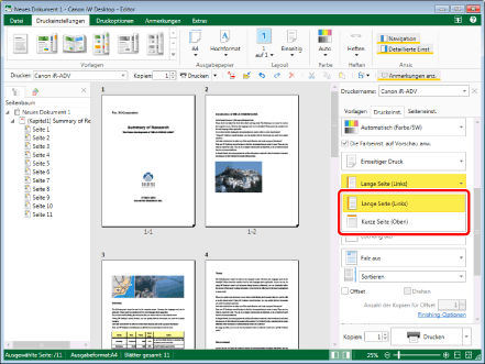 Diese Funktion ist nur möglich, wenn Sie einen Canon-Drucker auswählen und das Kontrollkästchen [Druckeinst. von Editor verw.] auf der Registerkarte [Druckeinst.] in der Detailansicht, im Menüband oder über die entsprechende Schaltfläche der Symbolleiste aktivieren.