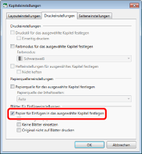 Wenn Sie für das gesamte Dokument Einfügeblätter festgelegt haben und im Dialogfeld [Blätter für Einfügeeinstellungen] das Kontrollkästchen für [Original auf Blätter drucken] aktiviert ist