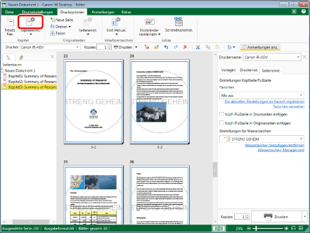 Beim Hinzufügen von Wasserzeichen zu Druckseiten werden im folgenden Fall verschiedene Druckseiten für jedes Kapitel verwendet.
