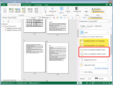 Die Einstellungen unter "Nächstes Kapitel drucken" werden wiedergegeben, wenn Sie das Arbeitsfenster anzeigen, drucken, Faxe versenden und in PDF-Dokumente exportieren.