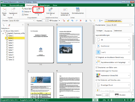 Diese Funktion ist nur möglich, wenn Sie einen Canon-Drucker auswählen und das Kontrollkästchen [Druckeinst. von Editor verw.] auf der Registerkarte [Druckeinst.] in der Detailansicht, im Menüband oder über die entsprechende Schaltfläche der Symbolleiste aktivieren.