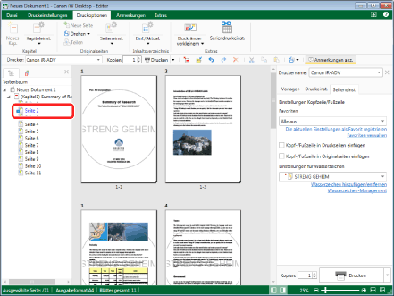 Sie können auch auf der Registerkarte [Seitenbaum] im Navigationsfenster mit der rechten Maustaste auf die Seite klicken, deren Einstellungen geändert werden sollen, und das Kontrollkästchen [Keine Wasserzeichen in ausgewählte Seiten einfügen] durch Klicken deaktivieren.