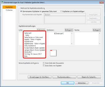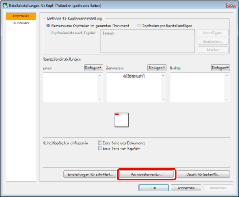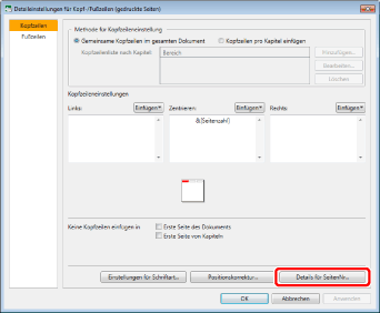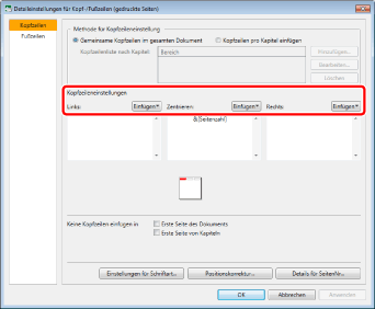Weitere Informationen zum Anzeigen Dialogfelds [Detaileinstellungen für Kopf-/Fußzeilen (gedruckte Seiten)]/[Detaileinstellungen für Kopf-/Fußzeilen (Originalseiten)] finden Sie hier: