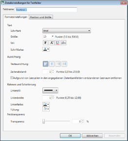 Wenn Sie auf diese Option klicken, wird das Dialogfeld [Detaileinstellungen für Textfelder] angezeigt. Sie können die Einstellungen des Textfelds im Dialogfeld [Detaileinstellungen für Textfelder] ändern. Nähere Informationen dazu finden Sie hier: