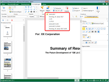 Die zuletzt verwendete Datumsmarke kann ausgewählt werden, wenn Sie einen der folgenden Vorgänge durchführen.