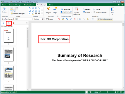 Im Anmerkungsmodus wird standardmäßig die Registerkarte [Miniaturansichten] im Navigationsfenster angezeigt.