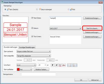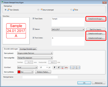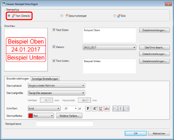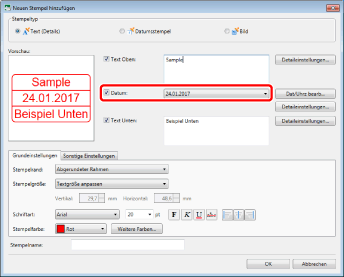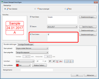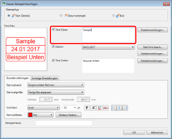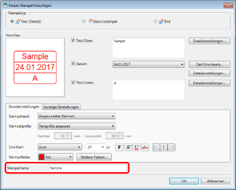Wenn Sie in [Stempelname] keinen Namen eingeben, wird automatisch ein Name anhand des in [Text Oben]/[Text Unten] eingegebenen Texts festgelegt.