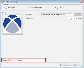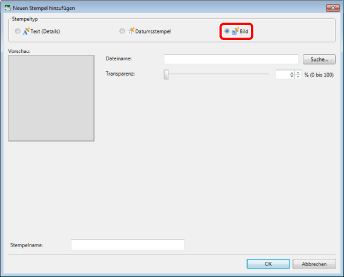 Klicken Sie auf [Suche] und geben Sie die im Bildstempel zu verwendende Bilddatei an. Oder geben Sie den Pfad der im Bildstempel zu verwendenden Bilddatei mit maximal 259 Zeichen ein (Summe der 2-Byte- und 1-Byte-Zeichen).