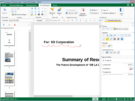 Wenn der Mauszeiger beim Zeichnen über den Seitenrand hinausgeht, wird die Freihandlinie so gezeichnet, dass sie auf die Seite passt.